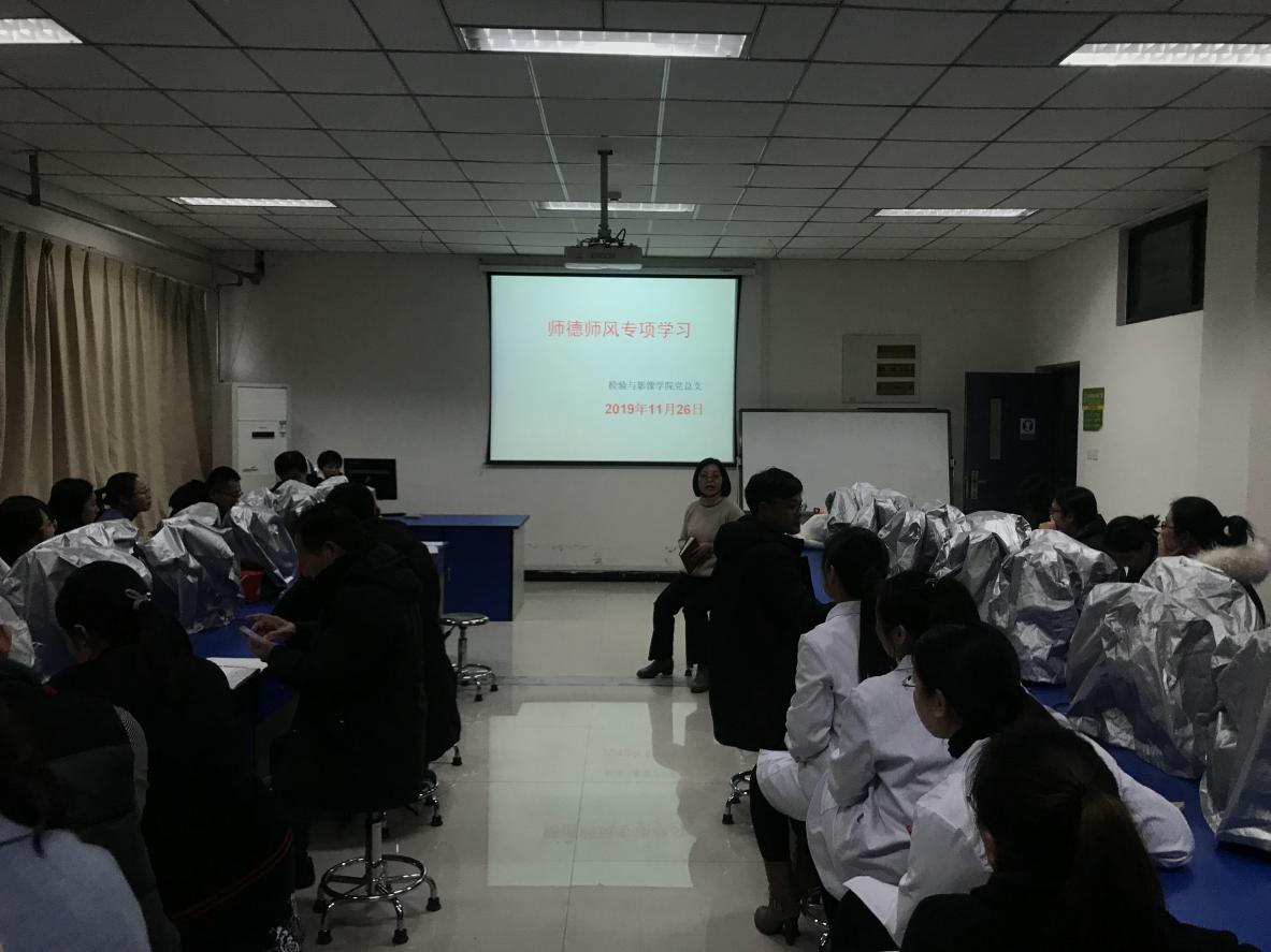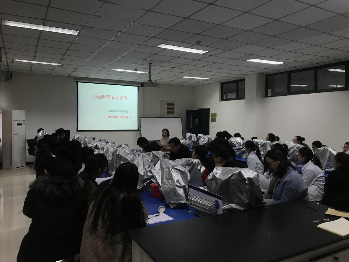 11月26日下午,检验与影像学院党总支组织全体教职工在院系楼四楼互动三实验室开展师德师风专项学习讨论。此次专项学习讨论,贺志安院长和赵云娟书记都结合亲身经历给我们讲述了我们身边的“师德师风”,让我们受益颇深。