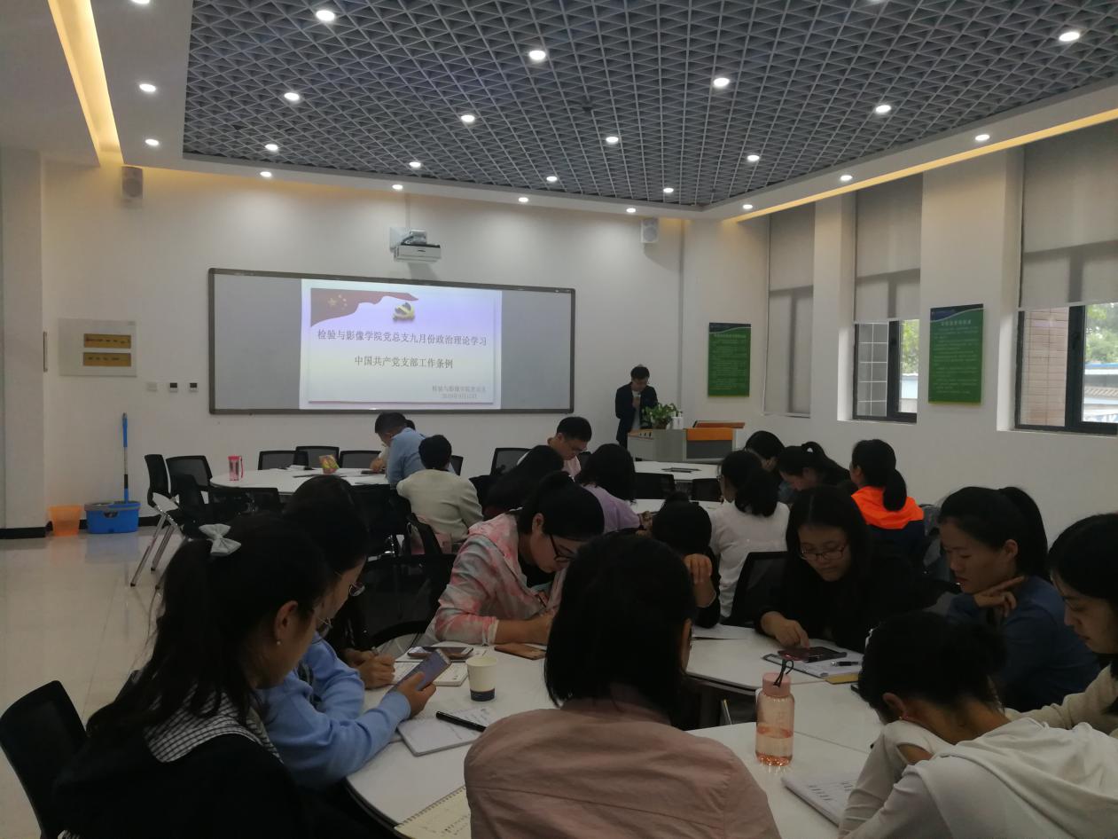 9月12日下午,检验与影像学院党总支按照政治理论学习安排计划,组织全体教职工在实训楼一楼开展9月份政治理论学习会议,集中学习研讨了《中国共产党支部工作条例》。会议由赵云娟主持,第一支部书记易东波带领大家学习,党总支全体教职工参加。