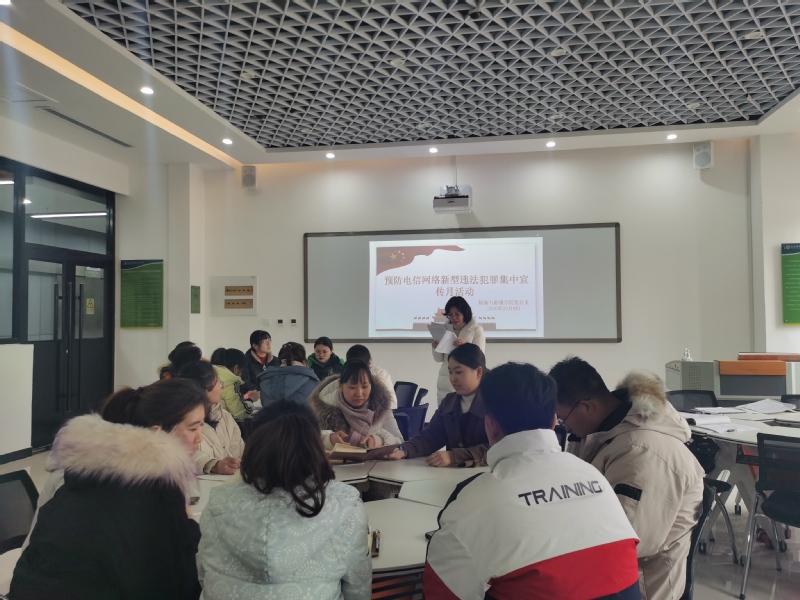 首先由赵云娟书记宣读本次活动指导思想,以习近平新时代中国特色社会主义思想为指导,按照中央、省委、示范区关于打击治理电信网络新型违法犯罪工作有关要求,坚持以师生满意为目标,深入开展各种形式的防范电信网络新型违法犯罪集中宣传月活动,严厉打击电信网络诈骗犯罪。其次赵云娟书记通过近期各校园发生的关于电信网络诈骗案例与各位教师进行分析讨论,让大家清晰的认识到电信网络诈骗的危害性及严重性,更督导各位老师提高电信网络诈骗意识,遇到不明电话,不明短信切记不回复,不搭理,更不应将自己的信息透漏给别人。