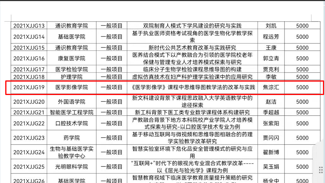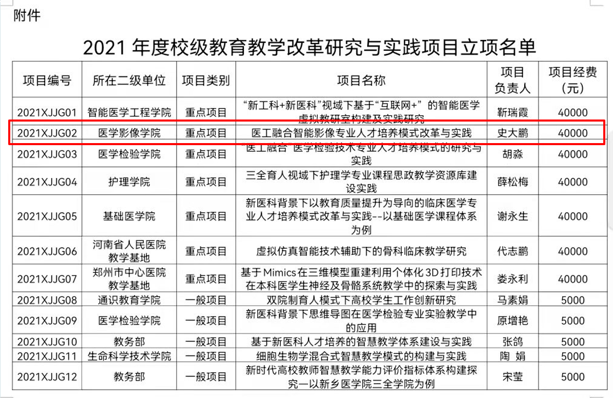 近日,按照《新乡医学院三全学院关于开展2021年度校级教育教学改革研究与实践项目立项的通知》(院发〔2021〕172号)要求,我校组织开展了2021年度校级教育教学改革研究与实践项目立项工作。我院共立项两项,一项重点项目和一项一般项目。我院史大鹏院长主持申报的“医工融合智能影像专业人才培养模式改革与实践”立项重点项目,该项目主要研究在“大、智、移、云”等新技术快速发展背景下,探索我校如何培养“懂技术的医学生”的新医科建设模式。我院焦淙汇教师主持申报的“《医学影像学》课程中思维导图教学法的改革与实践”立项一般项目,该项目有助于为贯彻和落实高校课堂教学改革提供行动依据,更好地发挥课程的育人作用。